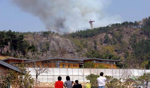 9일 경남 김해시 진영읍 본산리 봉하마을의 노무현 전 대통령 사저(사진 아래 펜스 뒤) 바로 뒷산인 봉화산에서 산불이 나 화염과 검은 연기가 치솟고 있다. 정종회 기자 jjh@노무현 전대통령의 사저가 있는 경남 김해시 진영읍 봉하마을은 9일과 10일 표면적으로는 평소와 다름없는 모습이었다. 하지만 사저쪽에서는 노 전대통 부부가 침통한 표정으로 거닐고 있는 사진이 부산일보 등에 보도되자 예민한 반응을 보이면서 불편한 심기를 드러내기도 했다.