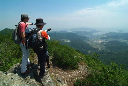 '신 낙남정맥' 구간 중 화산에서 굴암산 가는 주능선 전망바위에서 바라본 진해만 풍경.백두대간을 척추 삼아 힘차게 뻗어나가는 한반도 산줄기의 끝은 어디인가?
