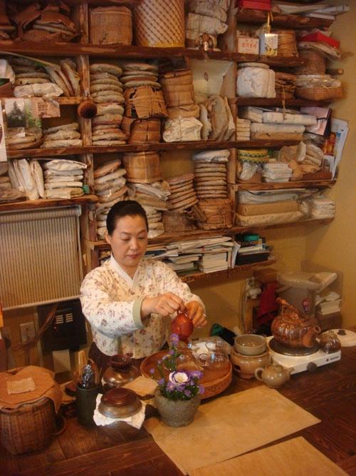 그 이야기를 그는 부산 중구 남포동 전통다원 '다해정'에서 그의 말대로 이마에 땀이 송골송골 맺히면서 하는 것이다. 한복 차림에 쪽찐 머리를 한 이 집의 사장 김혜숙(54·사진)씨가 앉은 카운터 뒤편의 선반에는 중국의 보이차들이 가득 쌓여 있다. 한국의 녹차와 중국의 보이차는 생산되는 나라와 그 이름이 다른 것처럼 아주 다르다. "녹차는 덖어서 열로 그 맛을 포착시켜 놓은 것이고 보이차는 발효시킨 것"이라고 김씨는 설명했다. "또 대별하건대 한국의 녹차는 살아 있는 잎에서 느낄 수 있는 깊이가 깊고, 중국의 보이차는 부드럽고 넓다고 할 수 있어요."