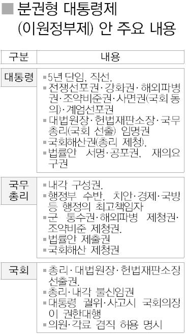 자문위는 이날 전체회의에서 국무총리가 치안과 경제 등 내치는 물론 외교·안보·국방 권한까지 갖는 의원내각제와 유사한 분권형 정부 형태를 다수의견으로 채택할 예정인 것으로 알려졌다. 미국식의 4년 중임 정·부통령제는 2안으로 제시될 예정이다.