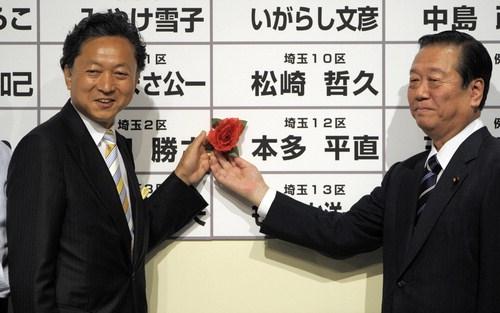 30일 치러진 일본 총선에서 민주당 압승을 주도한 하토야마 유키오(왼쪽) 대표와 막후 주역 오자와 이치로 대표대행이 도쿄의 선거본부에서 당선한 후보자의 이름 옆에 꽃을 달아주고 있다. 도쿄(일본)AFP연합뉴스30일 치러진 일본 총선에서 제1야당 민주당이 압승해 정권교체가 이뤄진 것은 자민당 54년 독주체제가 막을 내렸다는 상징성과 함께 '국민의 힘'이 '선거 혁명'으로 표출됐다는 점에서 큰 의미를 갖는다. 하지만 지난 반세기동안 깊게 뿌리내린 보수 기득권의 저항이 만만치 않을 것으로 보여 민주당의 개혁행보는 순탄치 않을 것으로 보인다.