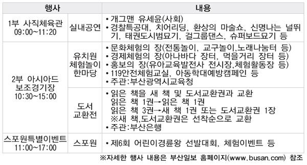 '무릎팍도사'의 인기 개그맨 유세윤의 사회로 진행되는 실내행사에는 경찰특공대작전, 묘기 치어리딩,환상의 매직쇼, 2부 야외행사가 펼쳐지는 아시아드 보조경기장에선 온 가족이 함께 참여하는 '유치원체험놀이한마당''도서교환전''119안전체험교실' 등 다채로운 행사가 펼쳐지고 스포원(금정체육공원)에서는 특별이벤트가 마련됩니다. 어린이 여러분의 많은 관심과 참여를 바랍니다.