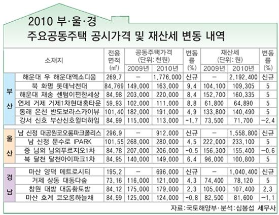 △부산·울산·경남 올해 공동주택, 공시가격 4~5% 상승에 재산세도 5% 정도 올라=지난해 주택가격 상승세 여파로 올해 1월 1일을 기준으로 한 아파트·연립주택·다세대주택 등 공동주택의 공시가격이 2009년 1월1일 기준 가격대비 전국평균 4.9% 상승했다.부산은 1년 전보다 5.5% 올랐고 울산은 4.1%, 경남은 5.1% 각각 상승했다.