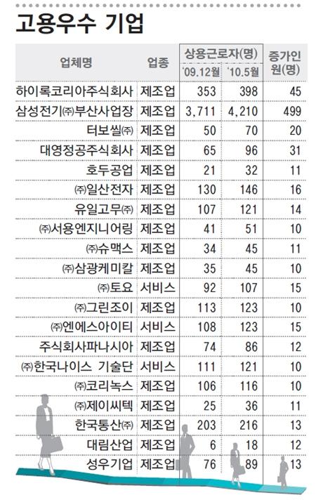 또 사상구 덕포동의 대영정공㈜은 신발부속품을 생산하는 중소기업으로 올 들어 5개월 동안 31명을 채용, 지난해 말 상용근로자 65명에서 96명으로 직원이 늘었다. 대영정공은 지난 2007년 10월 설립 당시 근로자가 20명에 불과했으나 약 3년 만에 직원 수가 약 5배 가까이 늘었다.