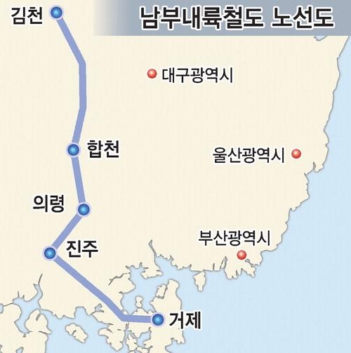 국토해양부는 19일 확정·고시한 '국가기간교통망계획 제2차 수정계획'을 통해 서부경남 일부 지자체가 치열한 유치경쟁을 벌이고 있는 남부내륙선의 노선을 김천~거제 구간으로 확정했다. 총 186.3㎞에 달하는 남부내륙선의 구체적인 통과지역과 국비 규모는 이달 말이나 내달 초에 최종 확정된다. 남부내륙선 노선과 관련, 그동안 경남 함양군은 대전~함양~거제를, 합천군은 김천~합천~거제를 주장하며 치열하게 유치경쟁을 벌여왔다.