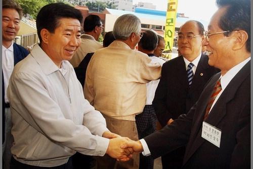 부산상고 동문체육대회에 참석한 노무현 대선후보와 신상우 동창회장의 악수 장면. 부산일보 DB신상우는 1971년 정계에 입문한 뒤 자신의 정치역정과 관련해 딱 두 권의 책을 냈다. 기자 출신 치곤 많지 않은 저작이다.