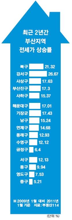 지난 2009년 말부터 중소형 아파트 부족으로 인해 부산지역에 전세난이 발생했다. 지난 2년간 부산지역은 평균적으로 15% 정도 전세가격이 상승했다. 최근에는 오른 전세 가격만큼을 월세로 전환하려는 움직임도 나타나고 있다.