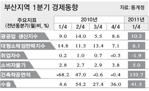 1분기 전국의 광공업 생산은 반도체, 자동차 등 수출 주도 업종을 중심으로 지난해 같은 기간보다 10.5% 증가했으며, 부산은 10.2%의 증가율을 기록했다. 울산은 8.1%, 경남은 8.9%가 각각 증가했다.
