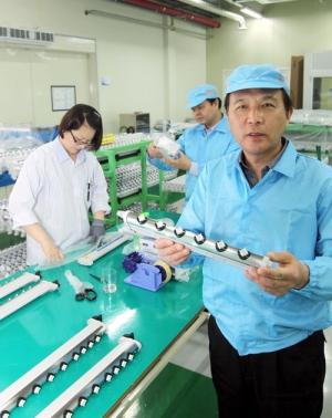 정전기 제거장치 전문업체 ㈜선재하이테크 이동훈 대표가 부산 기장군 일광면 청광리 본사 제품 생산라인에서 주력제품인 바 형태의 정전기 제거장치를 소개하고 있다. 김병집 기자 bjk@정전기 제거장치 생산 ㈜선재하이테크