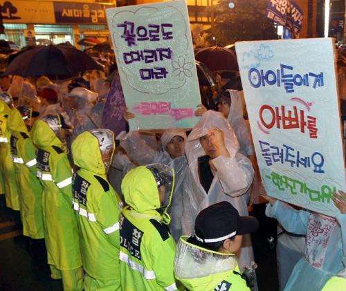 10일 한진중공업 정리해고 철회를 요구하는 '2차 희망의 버스' 참가자들이 행진을 막는 경찰 앞에서 피켓을 들고 시위를 벌이고 있다. 김병집 기자장대비가 쏟아지던 지난 9일 오후 7시 부산역. 비옷을 걸치고 우산을 쓴 사람들이 속속 도착했다. '희망버스'라는 플랜카드를 내건 버스들이 부산역 앞 도로에 하나둘씩 도착하자 부산역 광장은 이내 사람들로 가득찼다. '희망과 연대의 콘서트'가 시작되자 폭우 속에서도 참가자들은 자리에서 일어나 가수, 비보이 들의 흥겨운 문화공연을 지켜봤다. 오후 9시30분께 행사가 끝날 무렵 부산역은 전국에서 모인 여러 단체들의 깃발과 1만여 명의 인파로 빼곡히 들어찼다.