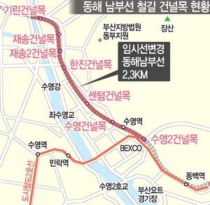 철도시설관리공단은 22일 부산과 울산을 잇는 동해남부선 복선전철화 사업에 앞서 해운대구 내 철도 건널목 7곳을 폐쇄한다고 밝혔다. 오는 10월부터 동해남부선 충렬로 구간 2.3km는 인근 임시선로로 운행선을 바꾸게 된다. 반여동 센텀피오레에서 우동 올림픽교차로까지 이어지는 이 철로 구간에는 2015년까지 복선화된 고가철로가 들어서게 된다.