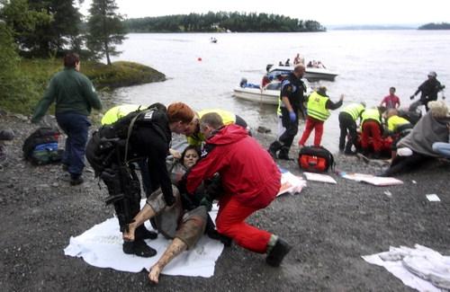 노르웨이 수도 오슬로에서 22일(현지시간) 연쇄 테러가 발생해 수십 명의 사상자가 발생했다. 사진은 노동당 청년캠프 행사장에서 벌어진 총격사건에서 부상을 당한 여성이 병원으로 옮겨지는 모습. AFP연합뉴스노르웨이의 정부 청사와 집권 노동당 행사장 등에서 22일 오후(현지시간) 연쇄 테러가 발생해 수십 명의 사상자가 발생했다.