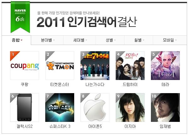 올해 1월부터 11월까지 네이버가 집계해 발표한 '2011년 인기 검색어' 순위에 따르면 종합 부문에서 '쿠팡'과 '티켓몬스터'가 각각 1위와 2위를 차지했다.