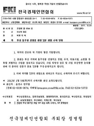 전경련은 3일 부산일보 등 지역 언론사와 동명대 등 지역 일부 대학에 '부산 돔구장 건설을 위한 태스크포스(TF) 위원 수락 요청서'(사진)와 돔구장 콤플렉스 TF사업 내용안을 발송했다.