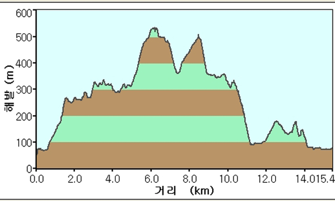 200m쯤 가다가 임도를 버리고 왼쪽 능선으로 접어든다. 20분간 꾸준히 오르막을 타면 499봉 갈림길. 직진하지 말고 오른쪽으로 꺾어 가파른 내리막을 타야 한다. 15분 후 임도다. 이때부터는 계속 임도를 타고 진행한다. 임도가 세 갈래로 갈라지는 지점에서 오른쪽 포장도로가 아닌 왼쪽 흙길을 택한다. 363봉을 오른쪽에 두고 5분 정도 전진해 임도에서 이탈, 오른쪽 산길로 접어든다. 낙엽이 쌓인 산길이 희미하기 때문에 주의해야 한다.