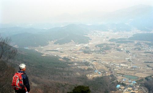 15분가량 잡목을 헤치고 오르면 뚜렷한 길과 만나는데 오른쪽으로 좀 더 가면 임도다. 100m가량 임도를 타다가 이탈, 왼쪽 능선으로 접어들어 3분만 가면 연화산 정상 밑 활공장이다. 이번 산행 구간 중에서 가장 탁월한 전망을 볼 수 있다. 정면의 두동면 은편리 들판 건너 동북쪽의 우뚝 솟은 봉우리는 신라의 충신 박제상과 그 부인의 애틋한 이야기가 전해져 오는 치술령(765m)이다. 그 오른쪽으로 눈을 돌리면 국수봉(603m)이다. 산과 산 사이에는 논과 밭들이 층계를 이뤘다.