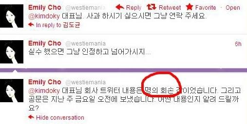 김 대표가 지난달 20일 여행 항공 정보를 제공하는 회사 트위터 계정에 "진에어 승무원의 상의 유니폼이 조금 짧은 것 같아 민망하다. 승무원이 고객들의 짐을 올려줄 때 보면 배꼽이 보이기도 한다"라는 내용의 트윗을 남겼다. 이에 조현민 상무는 자신의 트위터를 통해 "김 대표님 회사의 트위터 내용은 명의회손감"이라고 답했다.