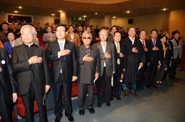 제33주년 부마민주항쟁 기념식이 16일 오후 부마항쟁참가자, 지역시민단체 회원 등이 참석한 가운데 부산 민주공원 대강당에서 열렸다. 참석자들이 국기에 대한 경례를 하고 있다. 강원태 기자 wkang@제33주년 부마민주항쟁기념식이 16일 오후 부산 민주공원에서 열렸다. 기념식에는 대선 후보 캠프의 주요 인사들이 참석하는 등 관심이 집중됐으며 부마항쟁특별법 제정의 필요성에 대한 목소리가 다시 높아지고 있다.