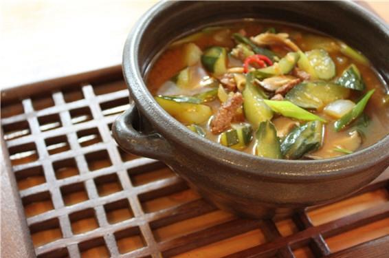 ·재료=오이 1개, 쇠고기(양지머리) 50g, 풋고추 1개, 붉은 고추 1/2개, 대파 1/4대, 장국 3컵, 고추장 3큰술, 된장 1작은술.