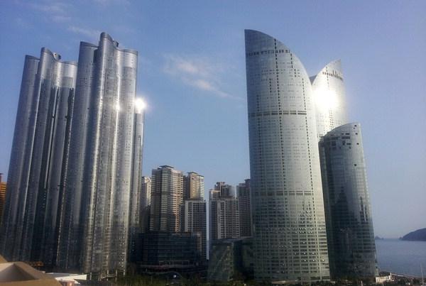 부산 해운대구 마린시티 초고층 아파트에 빛이 반사되고 있다. 부산일보 DB외벽이 유리로 된 초고층 건물의 빛 반사 영역이 태양만 비치는 곳보다 9도 높다는 연구 결과가 나와 눈길을 끌고 있다. 이는 한 여름 초고층 건물에서 빛 반사를 받는 인근 주민들의 고통이 상당하다는 것을 의미한다.