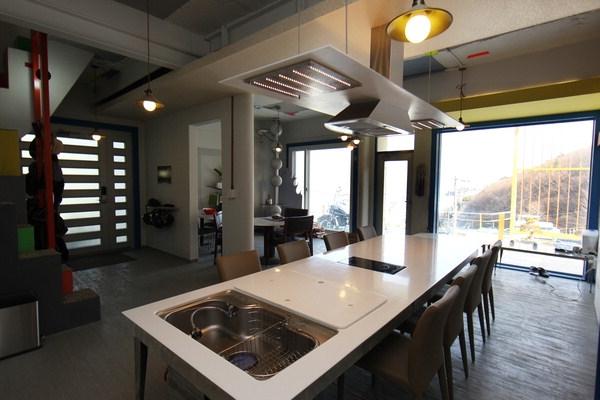 집에 들어섰다. 은은한 조명과 거꾸로 매달린 와인 잔, 분위기 좋은 카페 같다. 바닥은 분명 단단한데, 마루처럼 나뭇결이 선명하다. 테이블에 잠시 앉으니 산과 바다가 어우러진 한 폭의 풍경화가 통창에 찬다. 밤이면 집을 절반가량 덮은 철 구조물에 단 LED 램프가 빛을 내면서, 지나던 사람들이 카페나 레스토랑 같은 곳인 줄 알고 문을 두드린다고 한다.