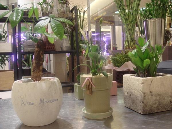 알마마르소 화원에서 촬영한, 사무실에서 키우기 좋은 관엽식물 화분. 왼쪽부터 파키라, 스파티필럼, 금전수.