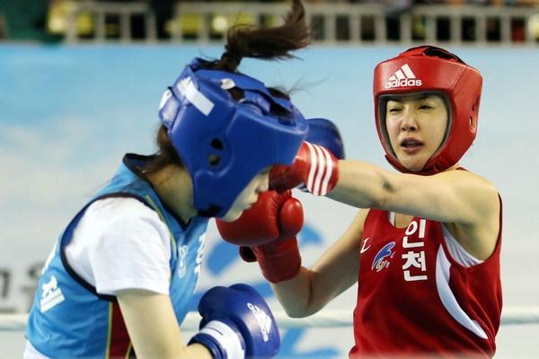 배우 겸 복서인 이시영(오른쪽)이 24일 충북 충주체육관에서 열린 2013복싱국가대표 최종선발전 여자일반부 -48㎏급 결승전에서 상대선수 얼굴을 공격하고 있다. 연합뉴스'여배우 복서' 이시영(31·인천시청)이 편파판정 논란 속에 마침내 국가대표로 뽑혔다.