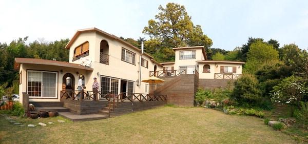 집은 총면적이 330㎡가량. 마당에 들어서면 아래가 각진 유럽형 갈색 지붕의 하얀 이층집이 왼쪽과 정면으로 이어져 있다. 높은 언덕 지형을 그대로 살려 지은 안채가 맞은편 거문산을 향해 불쑥 솟아 있다. 그 뒤로 거대한 참나무가 그림처럼 솟았다.