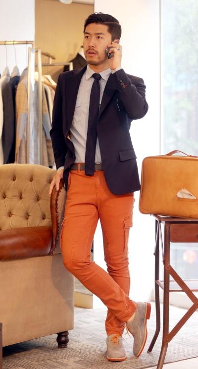 네이비색 재킷과 옅은 푸른색 리넨 셔츠, 채도를 낮춘 오렌지색 슬림 카고 팬츠에 스웨이드 소재 옥스퍼드화를 신었다. 바지와 같은 색의 신발끈이 눈에 띈다.