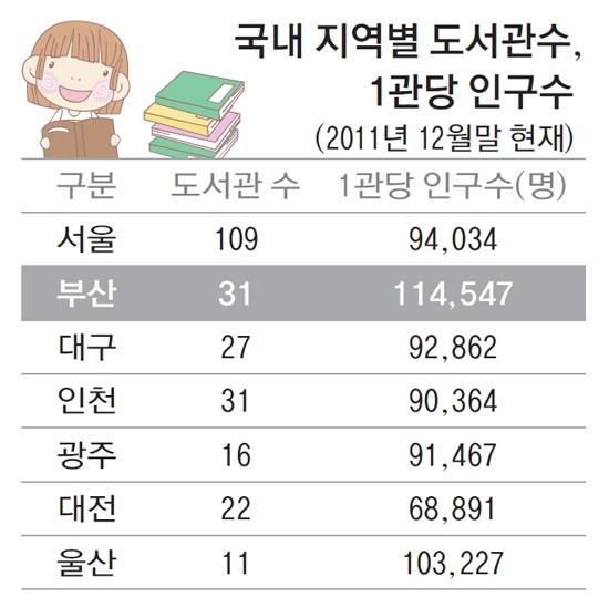 이 의원은 "국내 지역별 공공도서관 1관당 인구수(2011년 12월 기준)를 비교해 보면 부산은 11만 5천 명으로 서울의 9만 4천 명보다 2만 명이나 많고 전국 7대 광역시 중에서도 1관당 인구수가 가장 많다"며 "이에 현재 조성중인 시민공원에 부산의 대표도서관을 건립할 것"을 촉구했다.