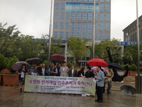 부산기독교단체연합은 지난 2일 부산시청 앞에서 기자회견을 갖고 "국정원 선거 개입으로 민주주의가 죽어간다. 국정원 선거 개입 사건의 진실을 규명해야 한다"며 철저한 국정조사를 촉구했다. 이날 기자회견에는 목회자정의평화실천협의회 부산인권상담센터 부산교회개혁연대 부산NCC 부산YWCA 부산YMCA 부산성서한국 생명평화선교네트워크 예수살기 등이 동참했다.