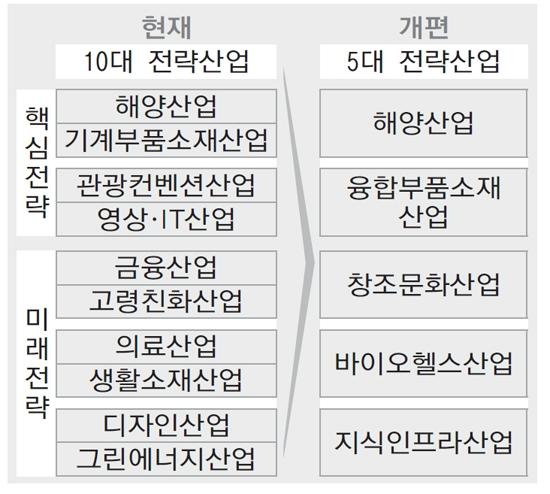 개편된 5대 신 전략산업은 예전의 △해양산업과 기계부품소재산업이 해양산업 △관광컨벤션산업과 영상·IT산업이 융합부품소재산업 △금융산업과 고령친화산업이 창조문화산업 △의료산업과 생활소재산업이 바이오헬스산업 △디자인산업과 그린에너지산업이 지식인프라산업으로 바뀐 것이다.