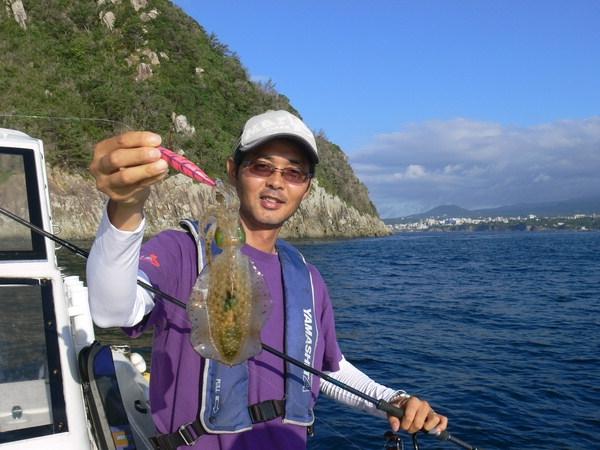 무한루어클럽 회원 강성무 씨가 제주 서귀포 섶섬 앞바다에서 새끼 무늬오징어를 에기로 걸었다. 제주 오징어낚시는 지금부터 시작되어 내년 2월까지 이어진다고 한다.먼바다에서 집어등을 밝히고, 갈고리가 달린 가짜 미끼로 오징어를 잡아내는 장면을 TV에서 봤다. 그래서 오징어는 울릉도 근방에서만 잡히는 줄 알았다. 우리나라 오징어는 10여 종 정도 되는데 말려서 먹는 대표적인 오징어는 살오징어이고, 하얀 뼈가 있는 몽땅하게 생긴 오징어가 서해에서 주로 나는 갑오징어이다. 그런데 무늬오징어라는 놈이 있다고 했다. 맛이 좋기로 유명한 한치오징어도 있다고 했다. 제주도였다. 제주도 사람들은 한치를 오징어라 부르고, 무늬오징어를 무늬라 불렀다. 한국 연안 오징어 루어 낚시의 시발지라 할 수 있는 제주에 다녀왔다.