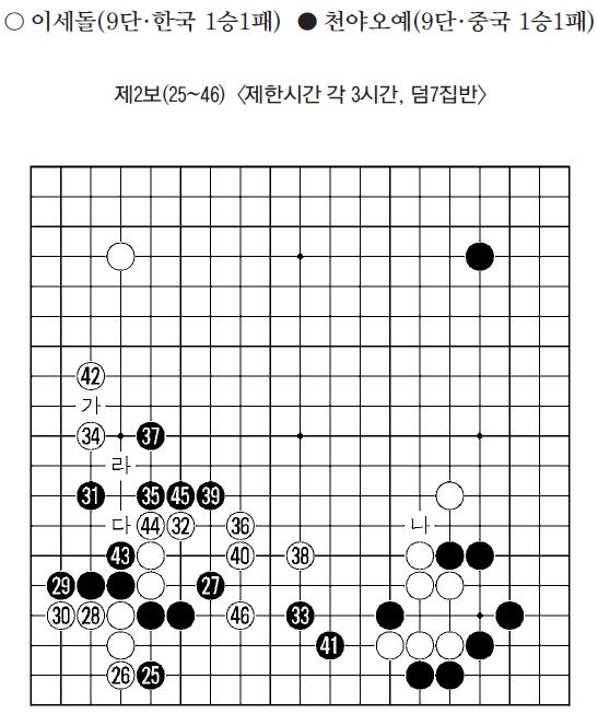 25부터 30까지는 많이 두는 진행이다. 지금 배석은 두 기사 모두 다 싸울 만하다고 생각하는 것 같다. 백도 흑에게 먼저 실리를 내주었으니 이 전투에서 공격의 대가를 얻어야 한다.
