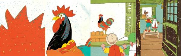 책은 붉은 바탕에 기하학적 무늬가 박힌, 도무지 뭔지 알 수 없는 그림 한 장면으로 시작한다. '뭐지?' 하고 다음 장을 넘기고서야 비로소 추상적 그림의 실체가 닭의 볏을 줌 인 했던 것임을 알게 된다. 그리고 책은 점점 한 단계, 한 단계 줌 아웃을 해 나간다. 다음 장에서는 조금 더 멀리서 닭을 바라보고 있는 두 아이의 뒷모습을 보여 주고 또 다음 장에서는 아이들이 닭을 바라보고 서 있는 집이 소녀가 만지작거리는 장난감 마을이라는 것을 보여 준다. 그렇게 한 발 한 발 뒷걸음질 치다 보면 비로소 그림은 우주 공간의 아득한 점에 다다른다.