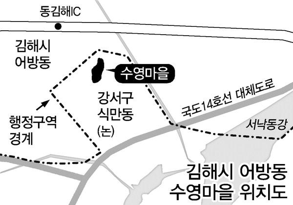 옛 경남 김해군 대저읍 일대에 대한 부산 편입 과정에서 부산 관할지역에 둘러싸여 섬처럼 남아있는 김해시 어방동 수영마을에 대한 경계조정 작업이 '김해평야'의 부산 편입 35년만에 본격화된다.