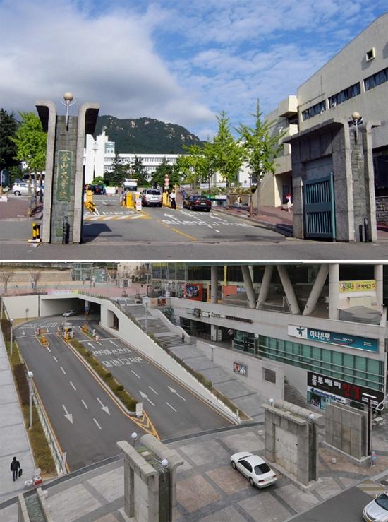 부산대의 옛 정문(위 사진)과 현재의 정문 주변 모습. 부산일보 DB부산대가 흉물스럽고 삭막하다는 지적 속에 논란의 대상이었던 정문의 디자인을 바꾼다.