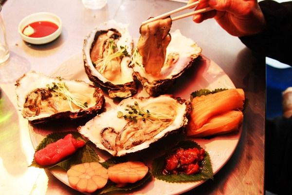 익혀서 먹으면 비리지 않고 담백하지만, 일부러 비릿한 향까지 즐기려 반은 회로 주문했다. 벚굴 위에 무순을 토핑해서 내고, 명란젓과 씻은 김치를 함께 차려내니 먹음직스럽다. 모처럼 벚굴과 회포를 풀었다!