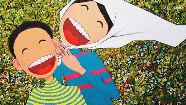 그저 웃고 있는 얼굴이니, 그리기도 쉽겠다고 생각하면 그에게는 꽤나 섭섭한 일일지 모른다. 웃는 얼굴을 극대화한 그의 그림을 자세히 들여다보면, 그가 나름대로 전하려는 철학, 생각, 삶의 방식 따위가 숨었다. 가지런한 이를 가득 드러낸 이의 손가락은 부처님의 수인을 하고 있는 그런 식이다.