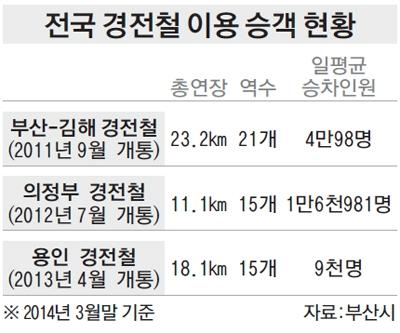 부산시는 지난달 31일 기준으로 부산~김해경전철의 올해 하루 평균 이용객은 모두 4만 98명으로 집계됐다고 3일 밝혔다. 이는 2011년 3만 84명, 2012년 3만 3천659명, 2013년 3만 8천112명 등 매년 10% 이상 증가하고 있는 것이다.