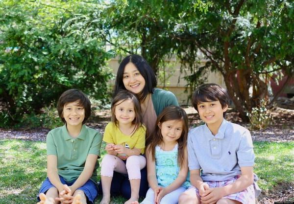저자인 크리스틴 그로스-노와 네 아이들. 저자는 여러 문화권에서 네 아이를 키우며 각 문화가 가진 전통적 양육 방식의 장점을 깨닫는다. 부키 제공"배 속에 있을 때가 제일 편할 때다!"