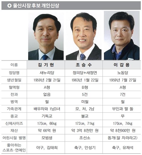 이번 선거는 새누리당 김기현 후보, 정의당과 새정치민주연합(이하 새정연)의 조승수 단일후보, 노동당 이갑용(54) 후보간 3파전 양상을 띠고 있다.