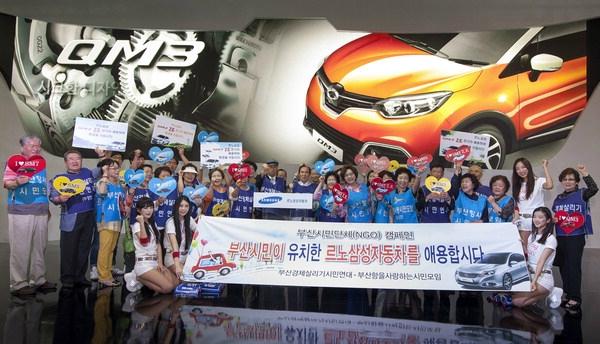 부산지역 시민단체가 1일 부산모터쇼가 열리고 있는 벡스코를 찾아 르노삼성자동차 애용 캠페인을 벌였다. 르노삼성차 제공"르노삼성자동차는 부산차입니다."