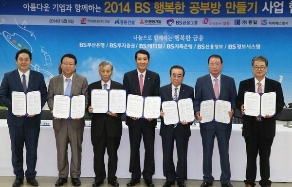 BS금융그룹은 9일 오후 부산은행 본점 7층 강당에서 지역의 6개 기업과 함께 '2014 BS 행복한 공부방 만들기' 협약식을 가졌다. BS금융은 부산지역 12개, 경남 10개, 울산 2개 등 총 24개의 시설을 대상으로 열악한 생활환경을 개선하는데 최대 7억 원 규모의 사업비를 지원키로 하고, 연내 공사가 완료될 예정이다. 지난해 부산지역 16개 시설을 대상으로 했던 사업을 올해에는 경남과 울산지역으로 그 범위를 넓혀 더욱 많은 아동센터에 그 혜택이 돌아가도록 했다.