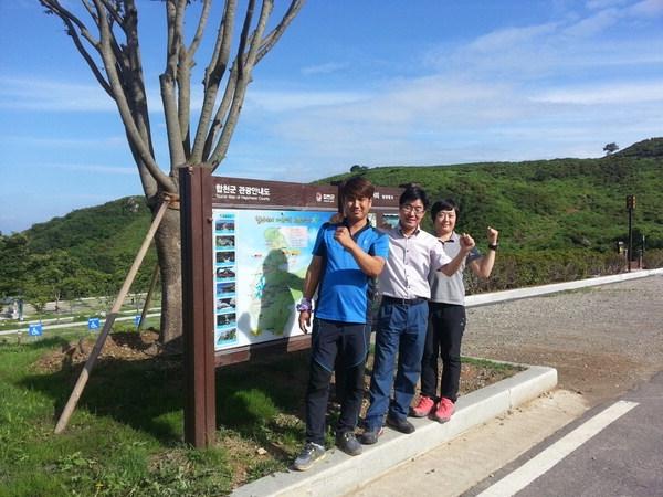 경남 합천군 황매산관리담당 한호상 계장(가운데)과 직원 2명이 황매산 입구에서 파이팅을 외치고 있다. 류영신 기자경남 합천군에는 매일 산에 오르는 공무원들이 있다. 합천군의 대표적 명산인 황매산을 관리하는 사람들이다.