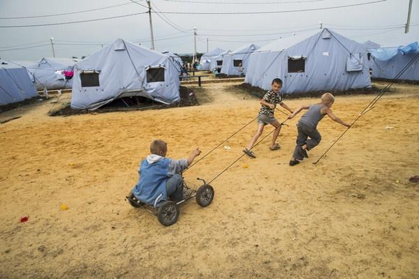 러시아 측이 우크라이나 도네츠크 인근 지역에 마련한 피난민 캠프에서 우크라이나 정부군과 반군의 교전을 피해 가족과 함께 피난 온 아이들이 천진난만하게 놀고 있다. AP연합뉴스러시아가 우크라이나에 군대를 투입한다면 북대서양조약기구(나토)는 우크라이나에 군사지원을 할 것이라고 경고하고 나섰다.