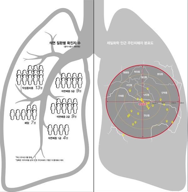 정체 모를 병마와 싸우기를 2년여. 2012년 11월 딸아이(39) 집으로 우편물 하나가 날아들었다. 연신초등학교 졸업생은 석면 피해가 의심되니 가족 모두 검사를 받으라는 내용이었다. 부산 연제구 연산1동 '제일화학'. 국내에서 가장 컸던 이 석면방직공장은 김 씨가 운영하던 '금성슈퍼'와는 300m밖에 떨어져 있지 않았다.