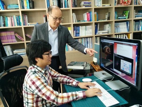 | 부경대 송하주 교수와 조현철 연구원이 개발한 GIS 기반 프로그램을 시연해 보고 있다. |