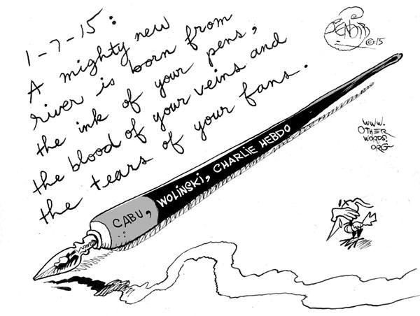 무슬림인 미국 시사만화가 카릴 벤딥이 샤를리 에브도 사건을 애도하며 그려 보낸 만평."시사만화는 사람을 공격하는 것이 아니라 정치적 견해와 행동을 비판하는 데 사용해야 합니다. 아랍인이 싫다고 무차별적으로 공격하는 것은 옳지 못합니다. 그렇지만 폭력으로 응수하려는 극단주의자의 행동은 더 납득하기 어렵습니다."
