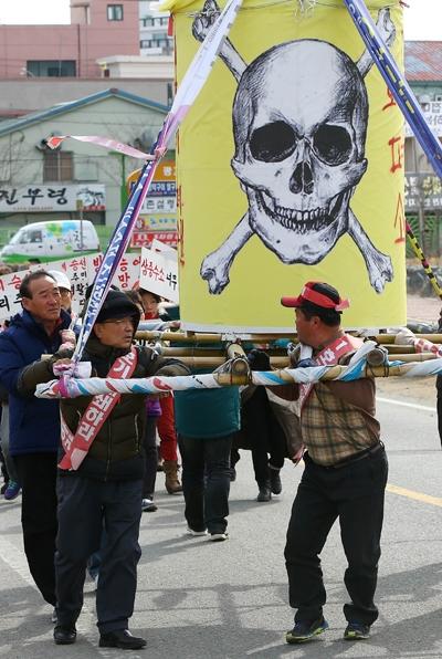원안위의 월성 1호기 수명 연장 결정이 알려진 지난 달 27일 경북 경주시 월성원전 주변 시민들이 월성 1호기 폐로를 촉구하는 퍼포먼스를 벌이고 있다. 연합뉴스"원전이 그리도 안전하다면 정책 결정집단이 모인 세종시에 하나, 서울 강남과 강북 사이 한강 가에 하나 세운다면 어떨까요?"
